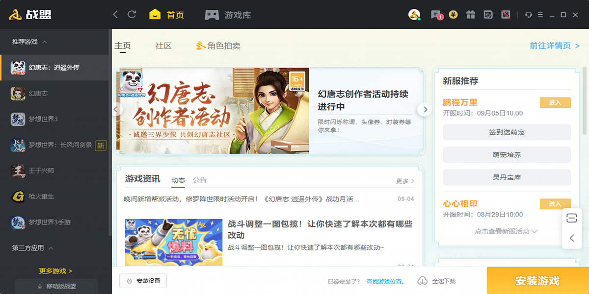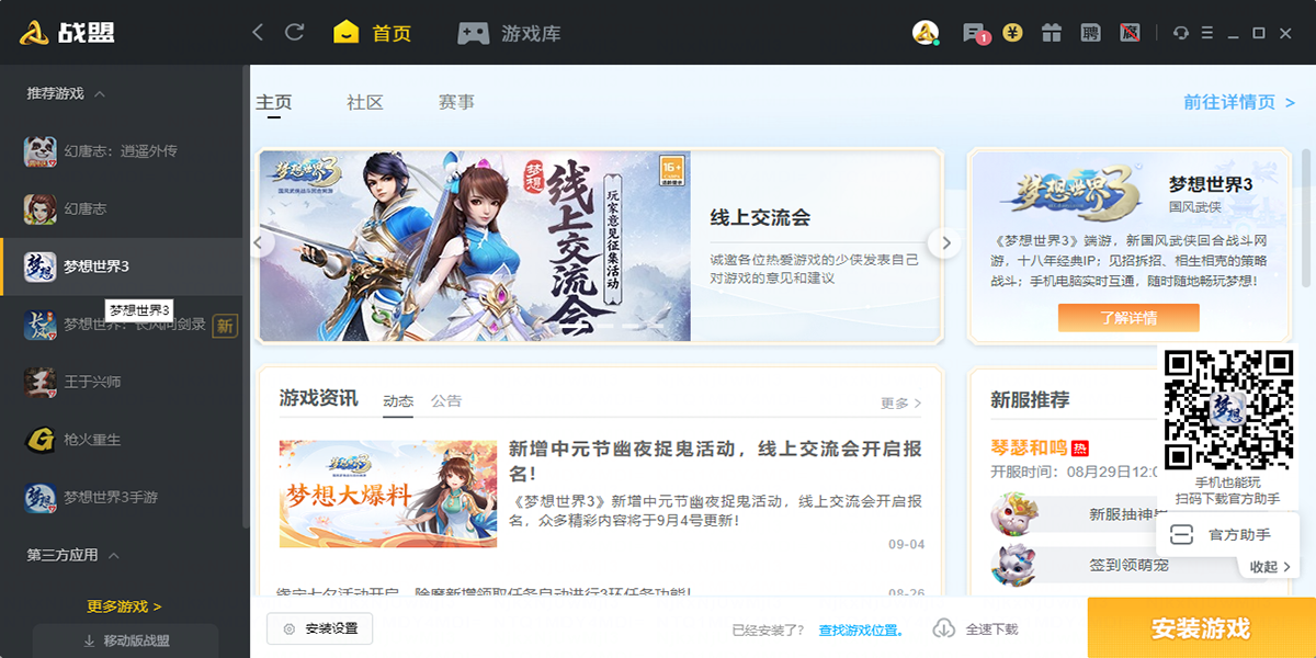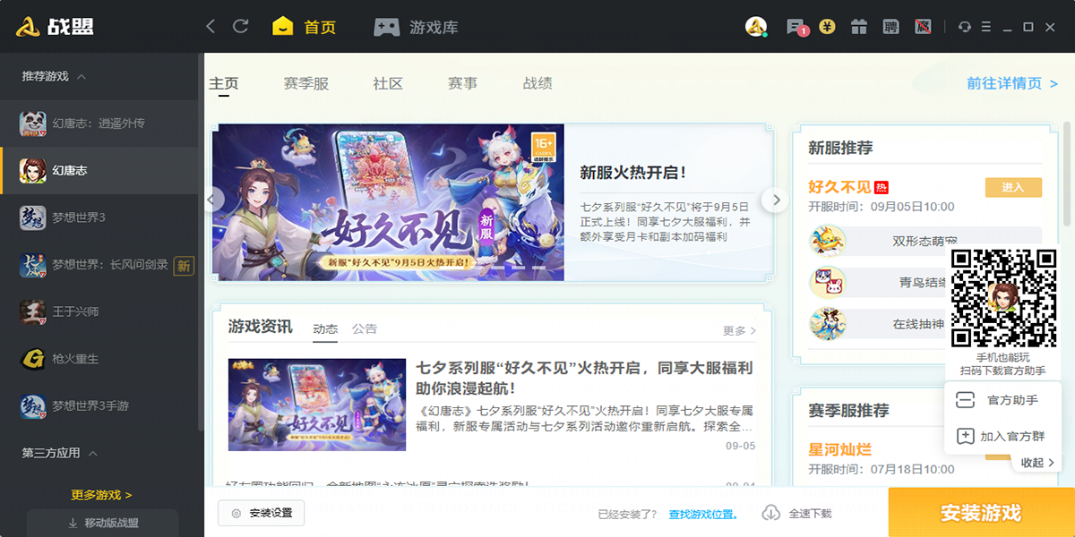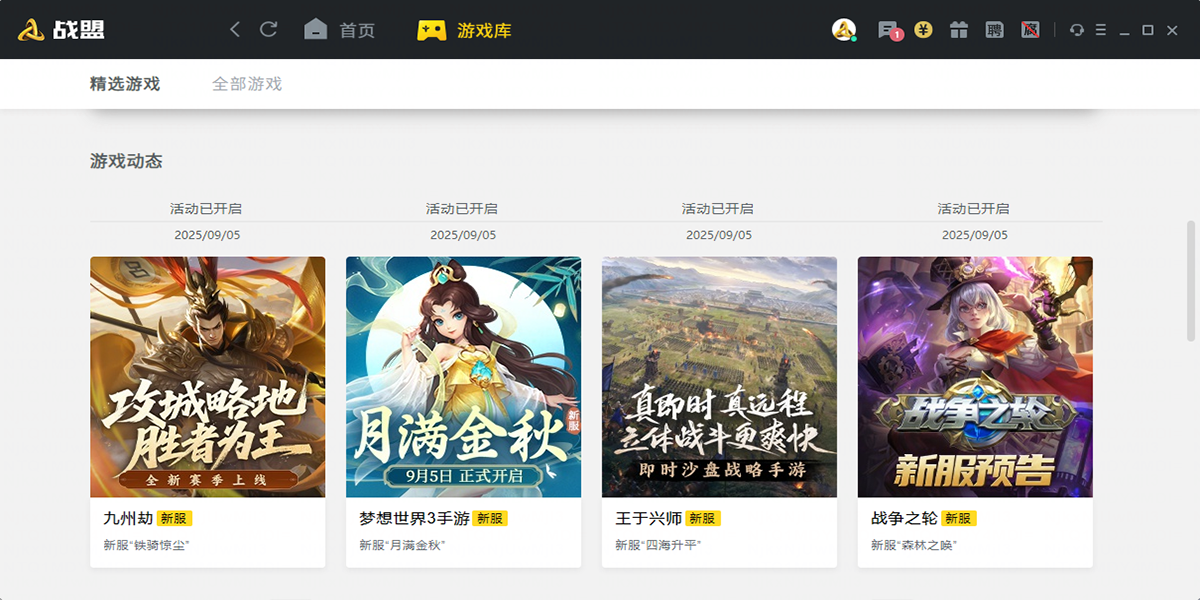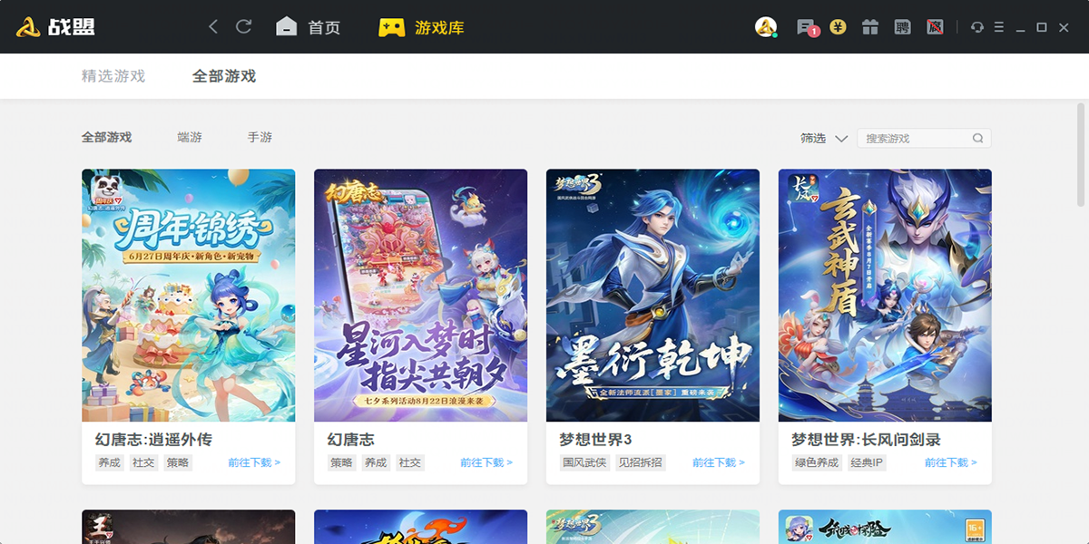 答:战盟主界面侧边栏只显示本地已安装的游戏和官方推荐的游戏,若需查看全部多益游戏,可前往战盟win客户端游戏库全部游戏中查看。