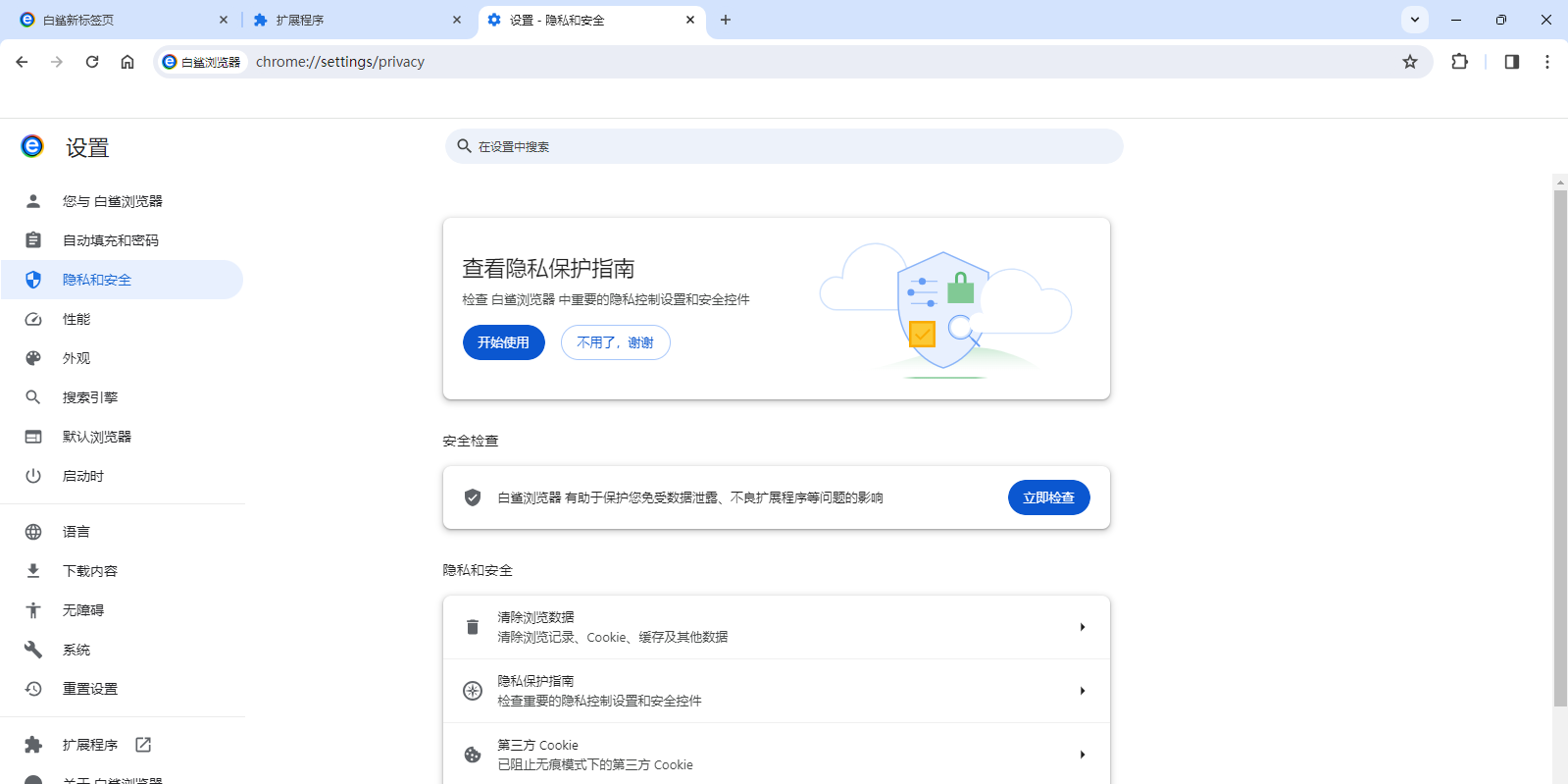 白鲨浏览器是一个基于chromium最新高速内核引擎的桌面浏览器!稳定高速内核,极速上网体验,简洁/干净/安全/保护隐私/好用的浏览器。