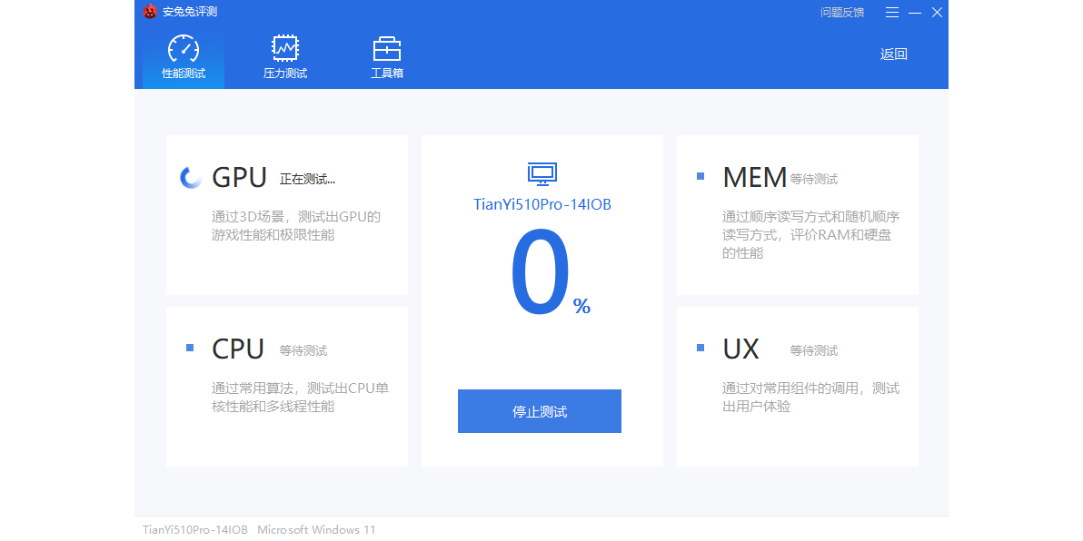 一键运行全部12个硬件性能测试项目,包括“多任务”、“ram运算”、“ram速度”、“cpu整数性能”、“cpu浮点性能”、“单线程cpu整数性能”、“单线程cpu浮点性能”、“2d绘图性能”、“3d绘图性能”、“存储i/o”、“数据库i/o”,完成测试后给出总分及每项测试分数。