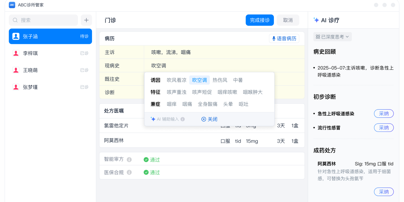 结合患者地域、年龄、病史等,ai 智能生成个性化诊疗方案与处方建议,中西医均支持,覆盖诊所常见病种。