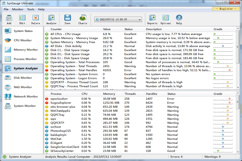 为了让用户快速检查当前系统状态,sysgauge提供了自动分析当前系统资源使用情况的能力,检查所有关键问题,并显示易于理解的系统分析结果列表。只需按主工具栏上的分析按钮,sysgauge将执行快速系统状态分析,检查cpu使用情况,内存使用情况,操作系统状态,所有磁盘的磁盘空间使用情况,并显示系统状态分析结果对话框。