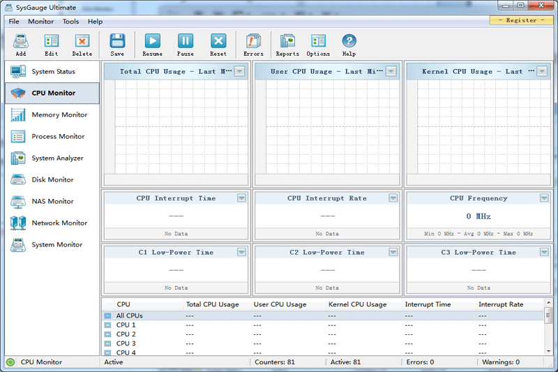 sysgauge能够为每个系统监控计数器指定用户定义的限制,然后播放通知声音,发送电子邮件通知和/或执行用户自定义命令,当一个或多个系统监视计数器上升或低于用户指定限制。