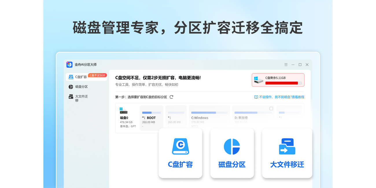 c盘扩容,磁盘分区,磁盘管理,分区助手,分区管理,还在为c盘爆满、系统卡顿而烦恼吗?金舟ai分区大师 - 您的智能磁盘空间管家,运用先进ai算法,为您提供智能、安全、高效的磁盘管理解决方案,彻底告别空间不足的困扰!