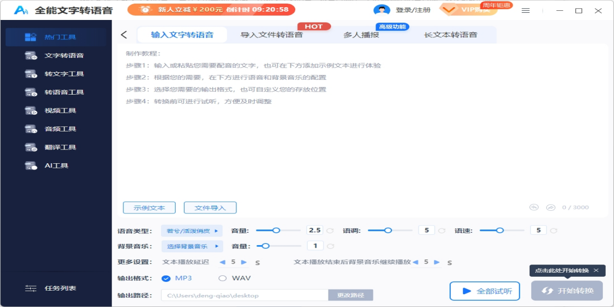 支持将文字转化为自然流畅的人声,提供多种语音类型和背景音乐,同时支持设置声音参数、多音字、插入间隔和多人播报。