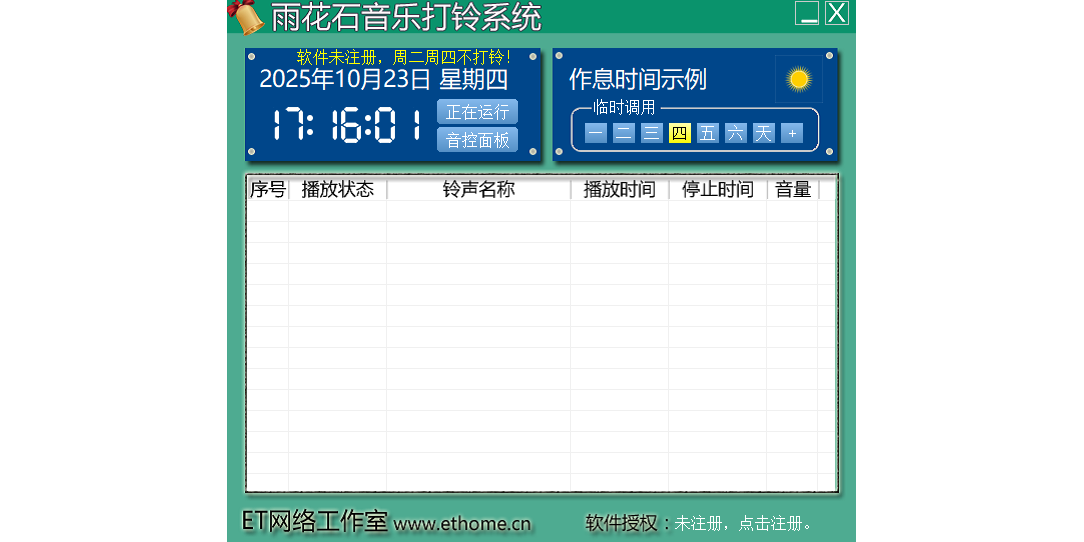 雨花石音乐打铃系统官方版是一款十分受欢迎且专业实用的可以自定义打铃时间,而且雨花石音乐打铃系统官方版还能自由编辑打铃时所播放的歌曲,随意控制播放音乐的时间,更重要的就属它的铃声非常准时有效,用来做备忘提示工具也不错!