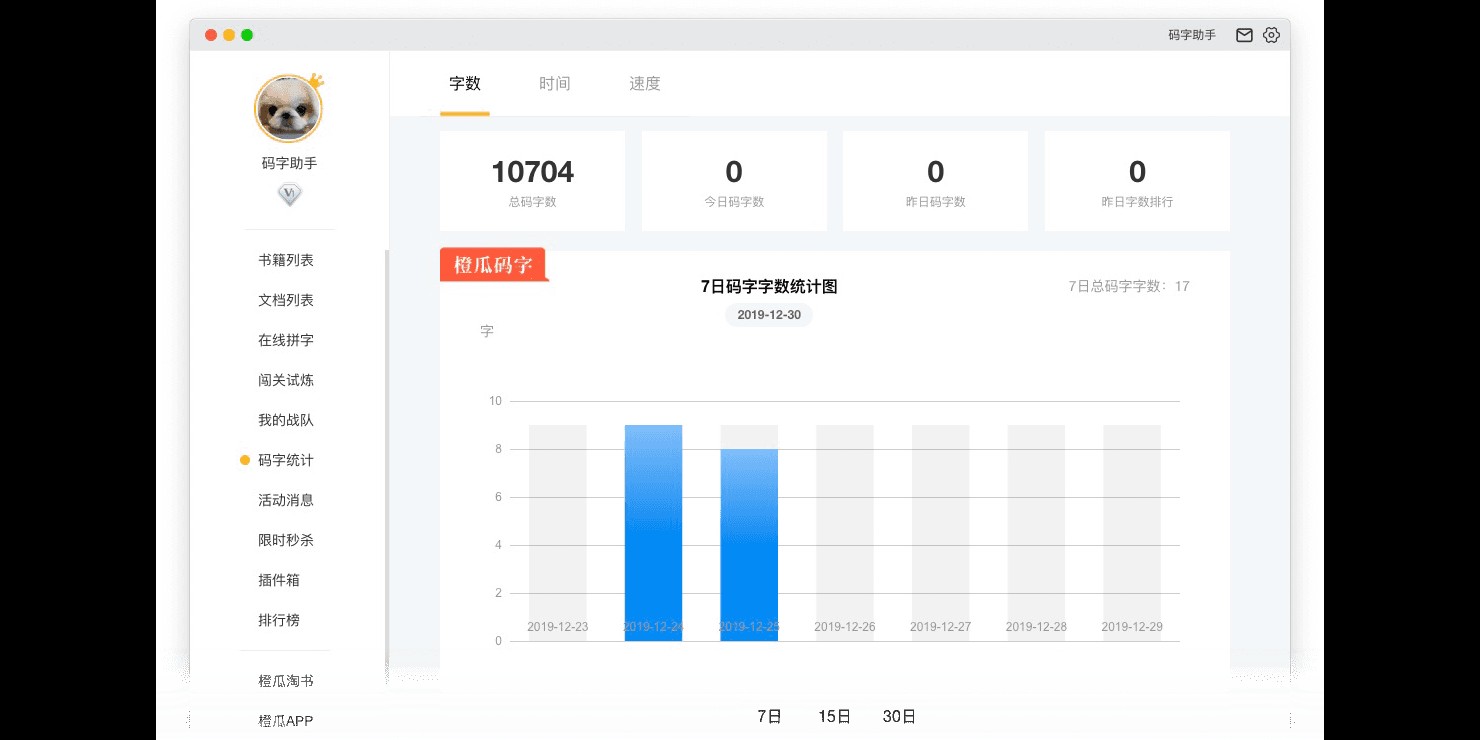 橙瓜码字还为用户配备实时数据统计功能,科学显示每日码字速度、码字日历、总字数统计,以直观的数据形式将个人使用数据展现在眼前,让用户轻松掌握码字进度。
