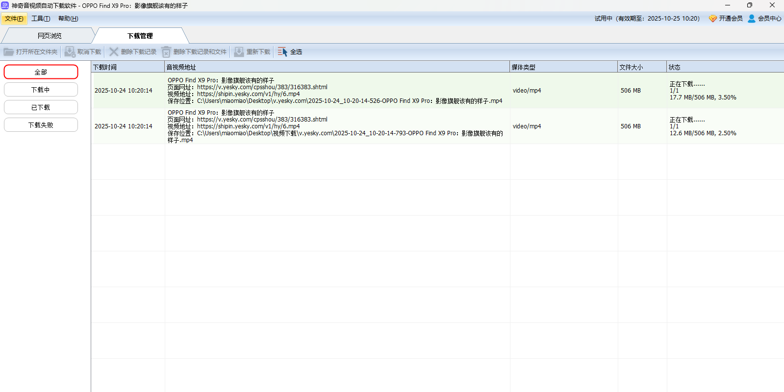 支持查看下载视频文件详细信息:下载时间、音视频地址、媒体类型、文件大小、状态等;