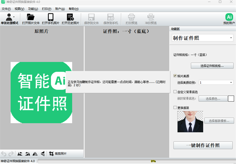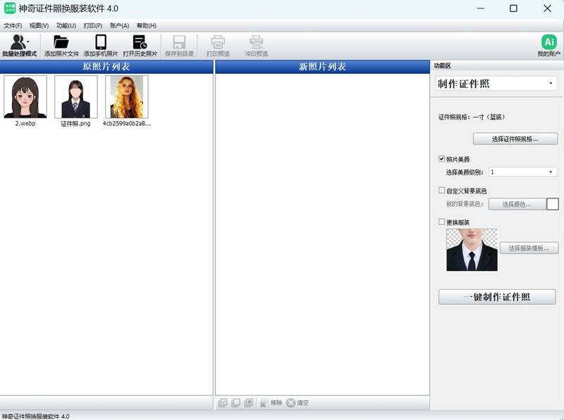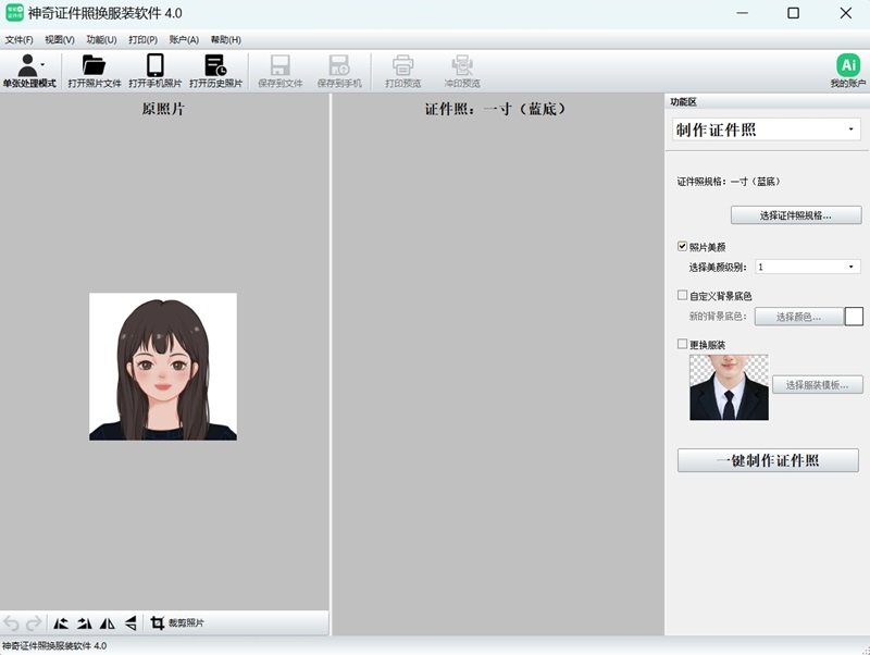 神奇证件照换服装软件,ai赋能制作标准证件照,支持10种级别美颜效果、自定义背景颜色、多种证件照服装替换。