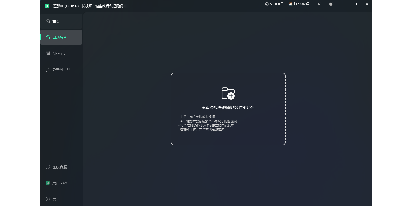 短影ai(duan.ai)是一个以人工智能驱动的长视频本地离线生成短视频内容创作软件,专为内容创作者设计,一键将长视频生成多个爆款短片,提高短视频内容创作效率。