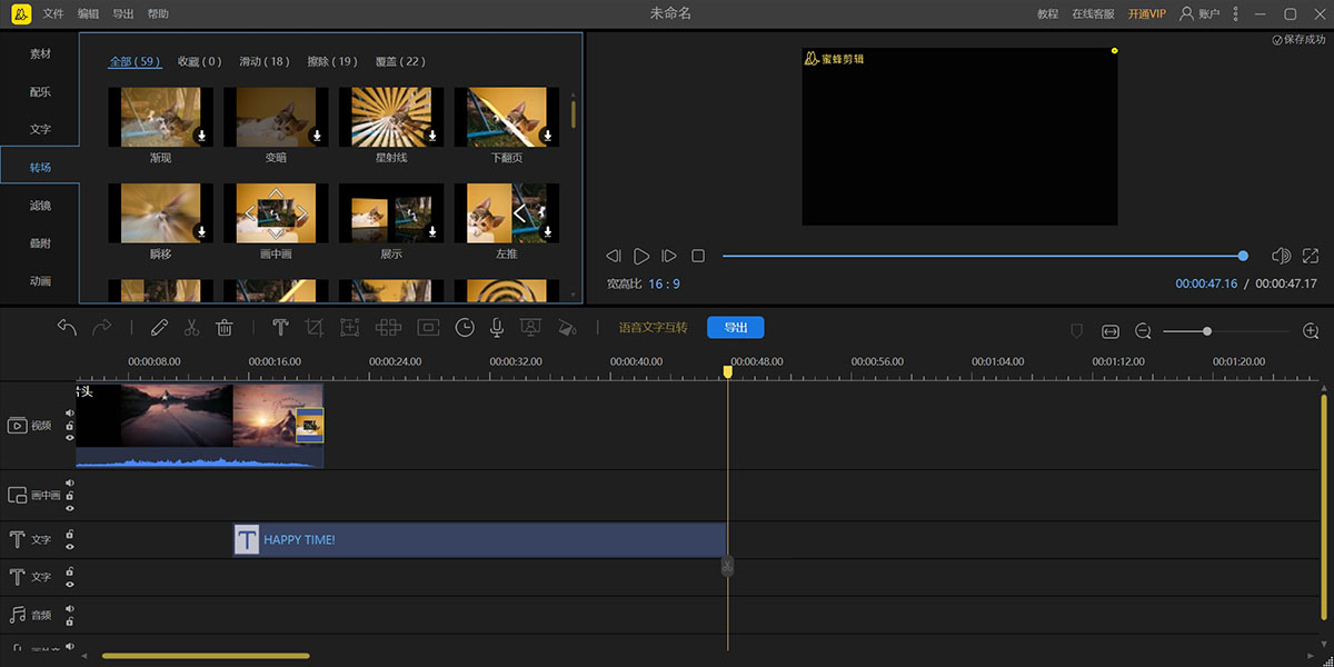 蜜蜂剪辑是一款专业的快速视频编辑软件, 可以帮助您剪辑视频, 添加音乐, 添加特效, 添加文字, 叠附效果以及设置转场效果, 制作出专业高品质的视频. 直观精美的界面让您轻松上手。蜜蜂剪辑在剪辑视频的时候比别的软件更方便,里面的功能和配乐都很多,是一款很好操作的软件。