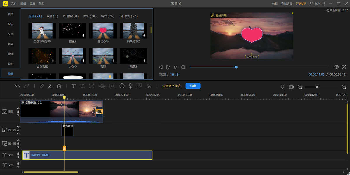软件允许每类素材多开轨道,叠加滤镜、叠附、动画、文字等特效效果,更加直观的编辑视频,增加画面层次感。