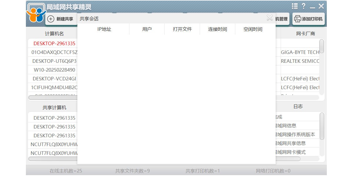 3. 快速便捷的新建共享文件功能,查看本地已经开启的共享信息