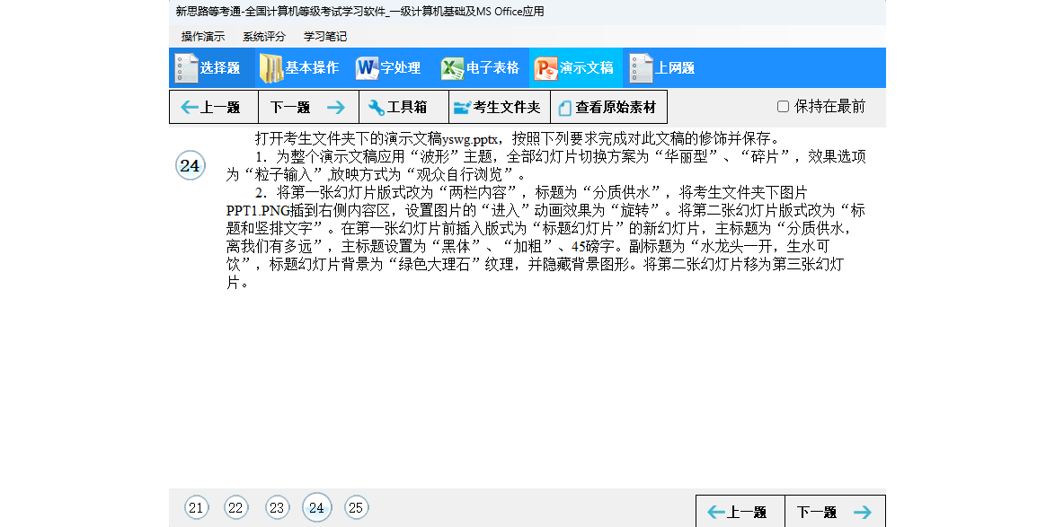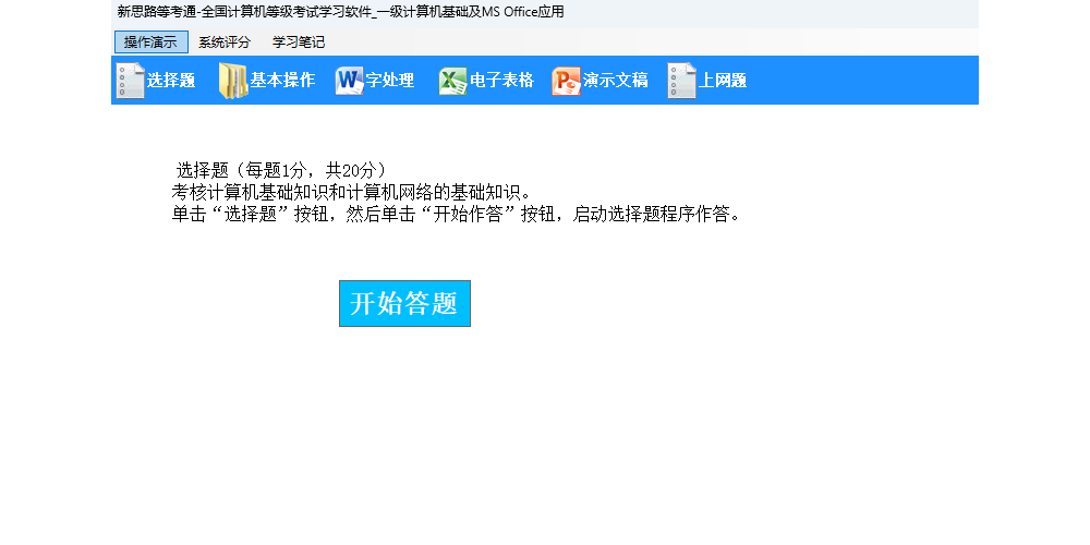 无纸化考试在中文版windows系统环境下运行,用来测试考生在windows的环境下进行系统操作、字处理、电子表格、演示文稿、选择题(计算机基础知识和微型计算机系统的组成)以及上网操作的技能和水平。