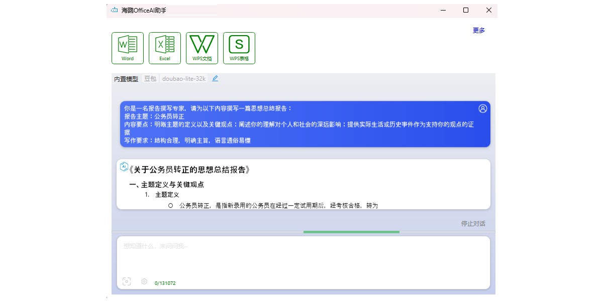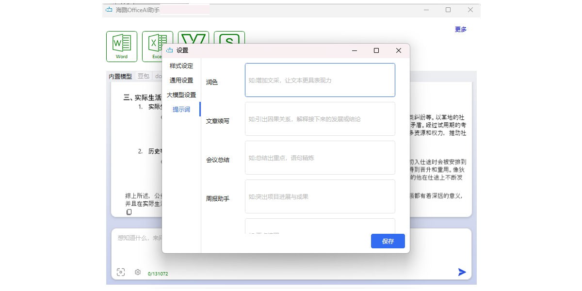 海鹦officeai助手是一款提升50%办公效率的智能助手软件,适合使用microsoft office 和 wps office 办公的用户,提供与 office copilot类似的功能和使用体验。无论你是在寻找如何输入“打勾(√)符号”的方法,还是想知道“怎么在插入表格前添加文字”,或者“该用哪个公式”, ai办公助手都能为你提供快速、准确的解决方案。 通过简单的指令,excelai 插件可以帮你自动完成复杂的公式计算、函数选择。 wordai 插件还具备整理周报、撰写会议纪要、总结内容、以及文案润色的强大功能。 总之,officeai 助手将大大提升你的办公效率,让日常工作变得更加轻松便捷。