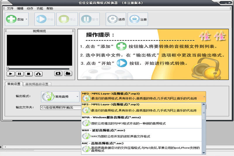 本软件支持mp3,aac,ac3,cda,m4a,wav和wma等音频系列,《佳佳全能音频格式转换器》还能够提取视频中音频,即将视频格式转化为音频格式。