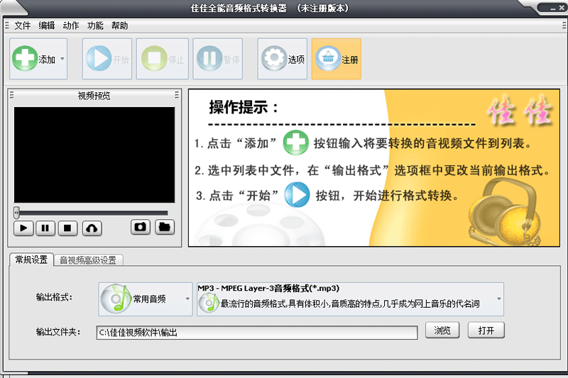 《佳佳全能音频格式转换器》是一款专业的并且操作简单的的音频格式转换工具、影视视频音乐提取工具、音频压缩工具。。佳佳全能音频格式转换器可以在mp3、wav、wma、cd、ogg、aac、rm、flac、ac3、m4a、cda等流行音频格式之间相互转换。还可以从各种视频格式中提取其中的音频声音文件,(如从rm、rmvb、vob、mkv、h.264、dat、vcd、svcd、dvd、asf、wmv、mp4、3gp、mov、qt、mpeg、divx、xvid、avi、3gpp2、dv等视频格式中提取其中的音频声音文件并保存为mp3、wav、wma、cd、ogg、aac、rm、flac、ac3、m4a、cda等音频格式)。
