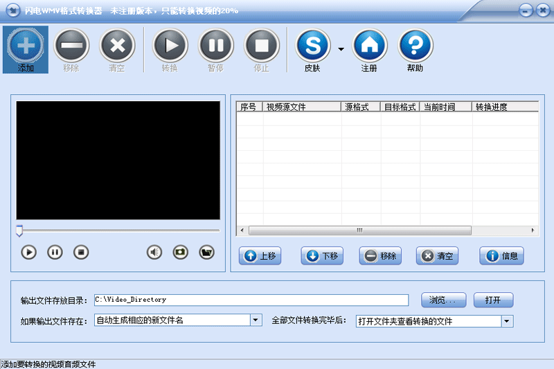 《闪电wmv格式转换器》是一款功能强大的微软wmv视频格式转换工具,软件可以帮您将各种流行的视频格式转换为wmv视频格式,如将rmvb、rm、avi、mp4、mpg、flv、3gp、mkv等格式转换为wmv格式。也可以将您下载的wmv视频格式转换为其他流行的视频格式。比如您需要将wmv转换为mp4、avi、3gp、mpg、mkv、flv等等视频格式,本软件都可以轻松完成。《闪电wmv格式转换器》预制了各种wmv格式转换功能(如标准wmv视频格式、高清wmv视频格式、移动设备wmv格式),可以满足您的不同的转换需求。使用后您可以将下载的wmv格式完美转换为iphone、ipad、ipod、ps3、psp、mp4、mp5播放器、安卓智能手机所能播放的视频格式。支持将wmv格式转换为常用的mp3、wma、wav等流行的音频格式。本软件支持批量转换、支持各种视频文件的播放预览、支持更换软件皮肤,操作极为简单,支持自动关机。总之使用后,wmv格式转换工作可以轻松搞定。