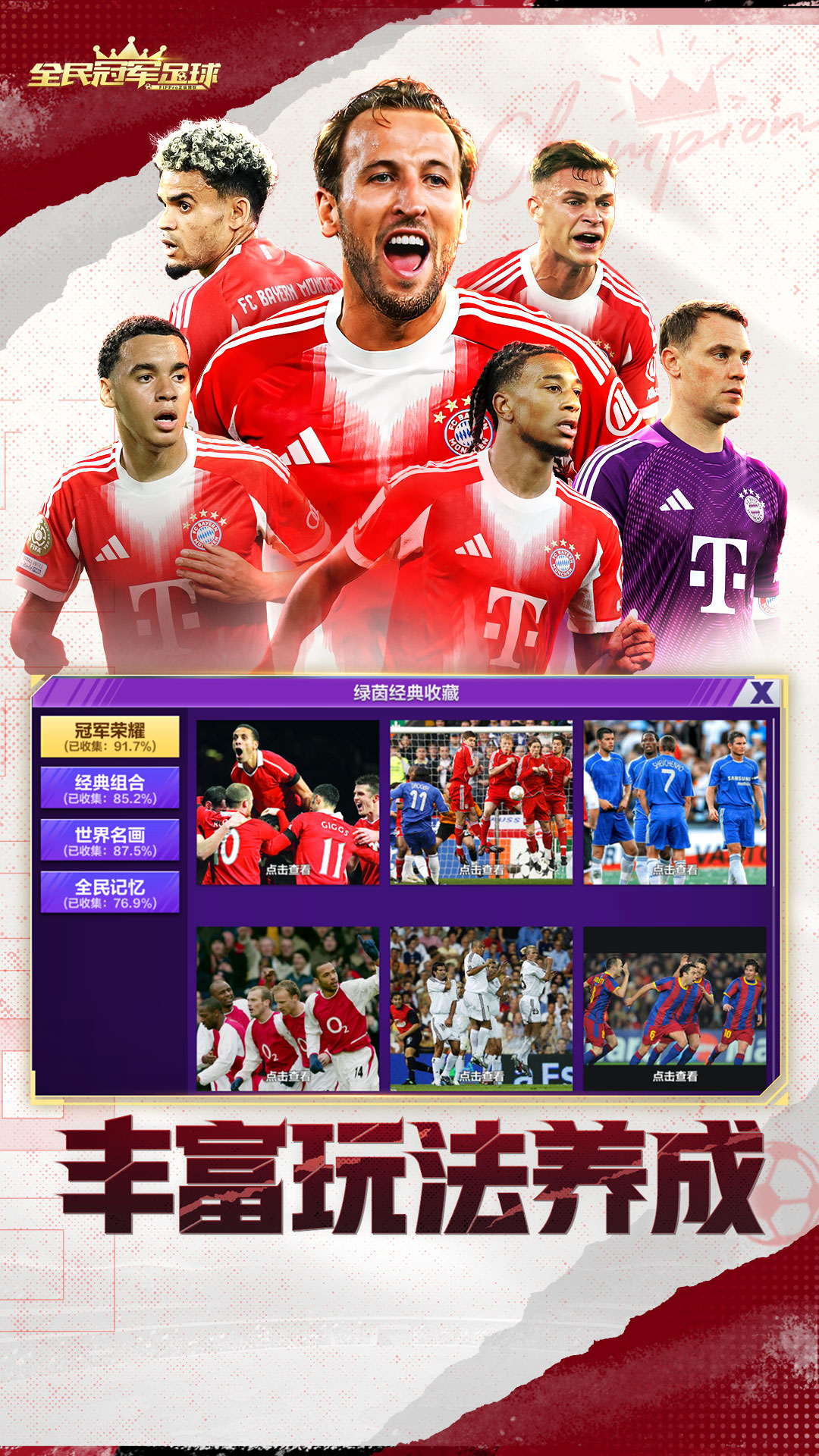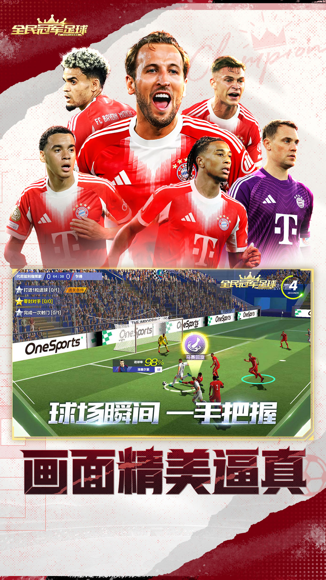 《全民冠军足球》是由fifpro官方正版授权的一款策略经营足球游戏,拥有2000+名真实球员实名登场。游戏采用全球领先的惯性与动作捕捉技术以及真实球员参与动作录制。除球员外,还摇拥有皇马,拜仁等多家豪门俱乐部的授权。游戏独创了”英雄时刻”玩法,让玩家体验亲临比赛现场般的操作感受,是一款真正为全世界足球爱好者量身定制的高品质足球手游。