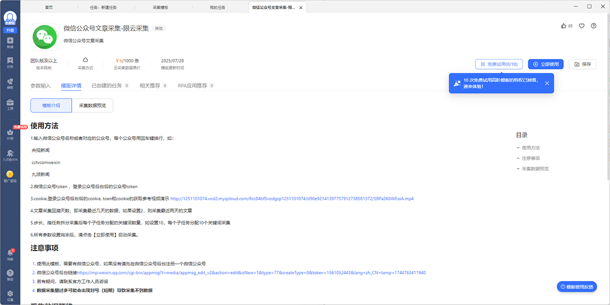 增加模板试用功能,免费体验高版本套餐专享的采集模板;