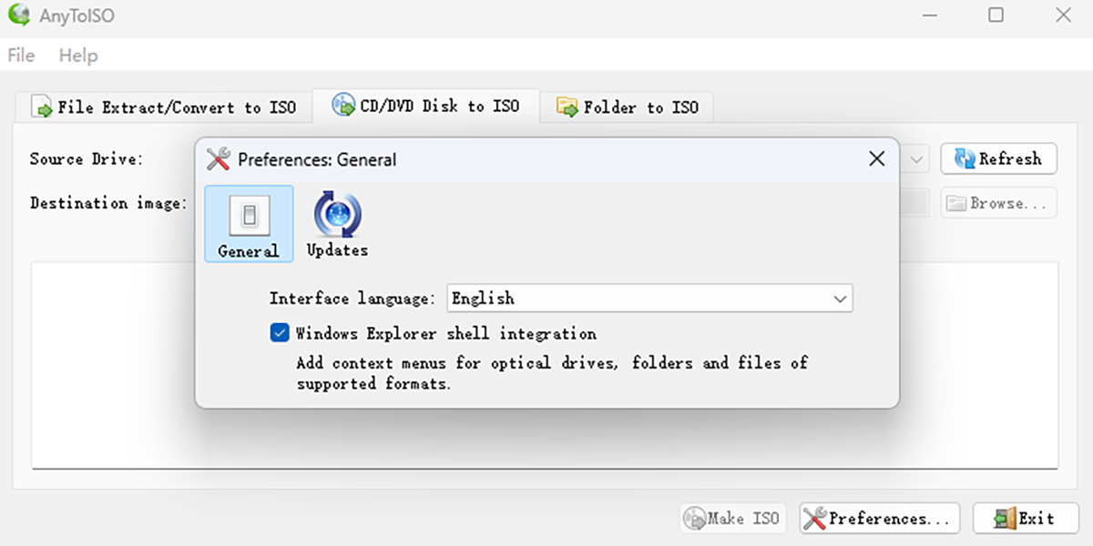选择cd/dvd iso,以在anytoiso选项卡,从列表中选择一个cd/dvd驱动器,并按制作iso按钮。创建bin/cue选项有助于创建具有多个曲目的raw图像(例如来自audiocd)。在windows上,可以直接从windows资源管理器通过光盘的上下文菜单创建iso。