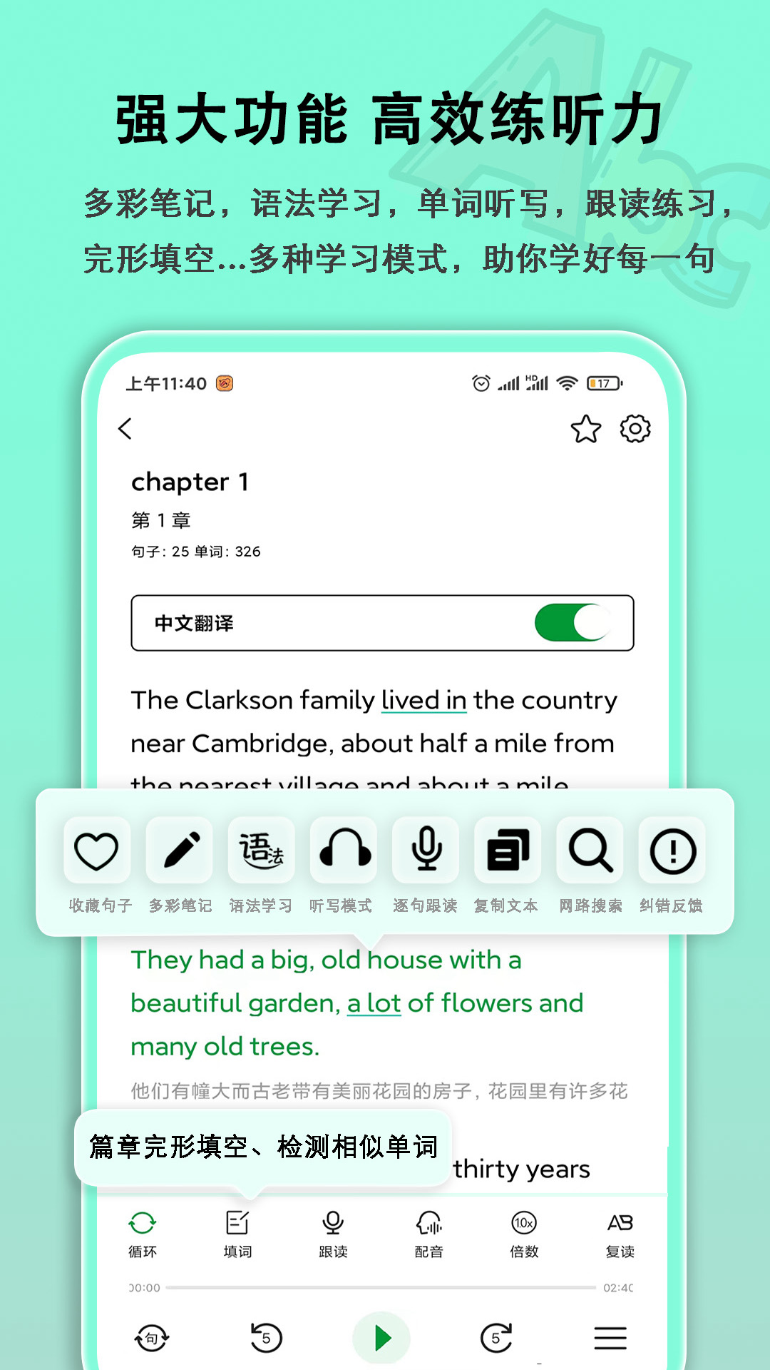 可查看句子的音标和连读,方便练习口语和听力。还可以进行口语评测和选择全篇的听力填词,用于精听名词、动词、形容词和副词。
