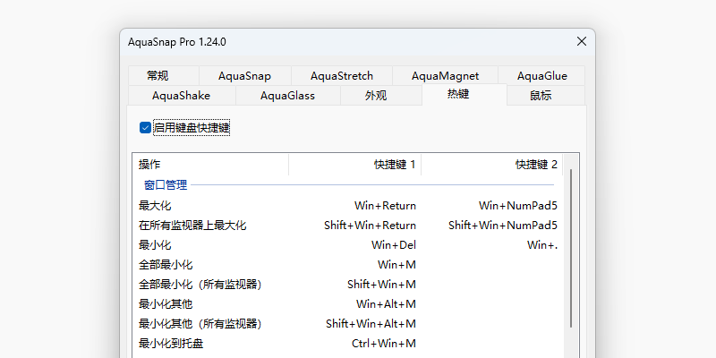 aquasnap是一款上手非常容易操作的且用于windows桌面窗口排列和布局的专业级管理工具。aquasnap支持屏幕边缘吸附与屏幕分屏即多显示器控制、摇晃窗口置顶与窗口自动拉伸等实用功能。可以让你自由的diy电脑窗口样式。