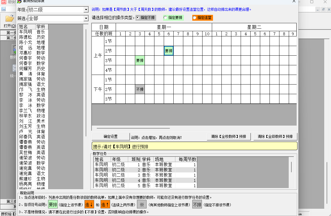 3.排课可准确控制,可以对全校,全年级,学科,甚至细到个人进行排课设置,如可对全校、整个年级设置公共课,也可以指定某学科某节不排,也可设置某教师某节不排、要排、连堂上课等。