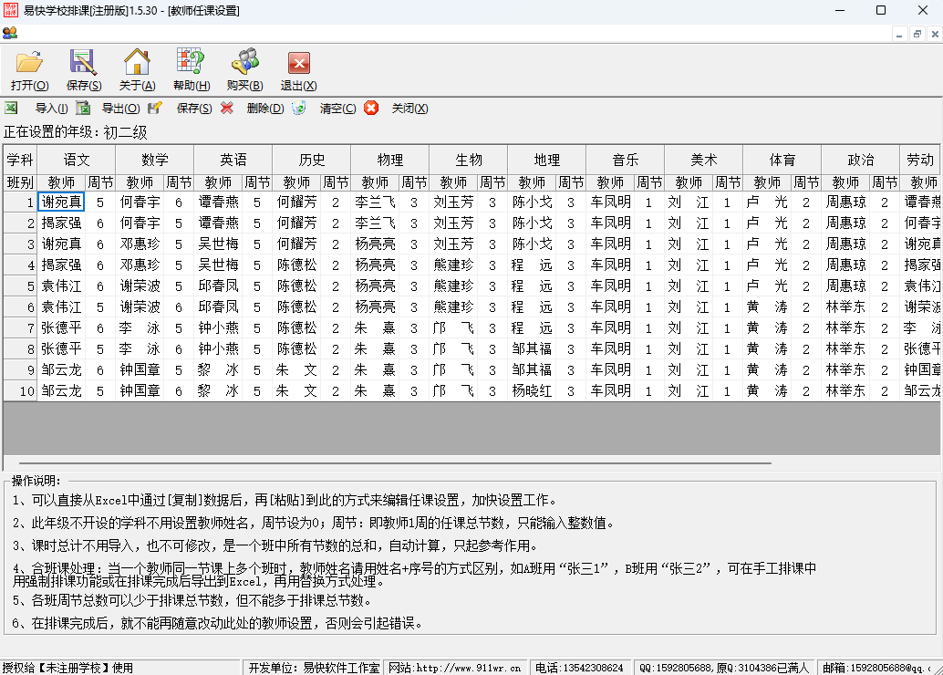 2.数据设置方便,如可设置课表天数、班级名称、上课场地、场地限制、学科排课优先级、 非任课(公共课)等,很多设置直接作简单的修改即可,对工作量最大的任课设置,我们提供了可从excel编辑好后,再直接导入或复制数据后再粘贴的方法,大大减轻排课前的工作量。