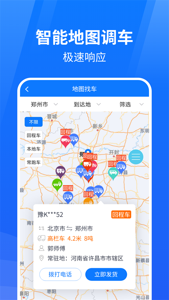 √ 地图找车:通过地图找车功能快速调配全国回程车、常跑车;