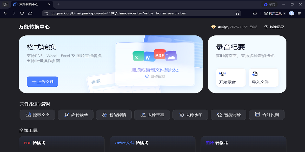 ●夸克pc浏览器的格式转换功能目前支持pdf、office、图片的转格式、提取文字、去除手写、去除水印等功能,其他功能暂时需要在手机端进行操作,详情您可以下载夸克pc浏览器进行体验。