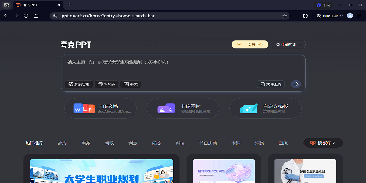 ●亲,您可以在pc浏览器首页点击左上角星星状图标进入夸克ai功能--点击【夸克ppt】--在输入框输入您要制作的ppt主题即可初步生成ppt大纲,您可在左侧对ppt大纲对内容进行修改,修改后可点击【应用大纲】即可同步至ppt。如果您需要更换ppt风格和背景,可以点击右上角【更换风格】选择喜欢的风格进行切换。最后,点击【保存ppt】即可完成ppt的制作啦。