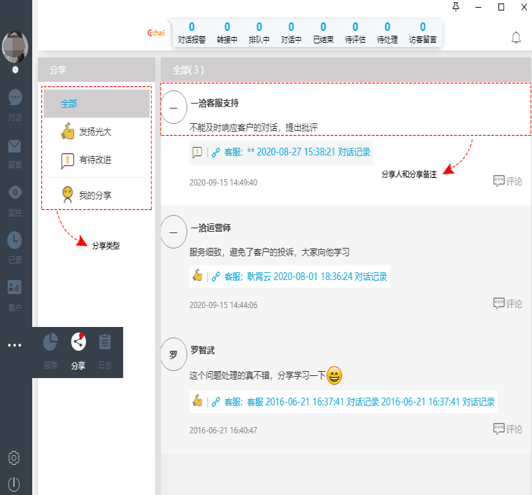 对话、留言、推送、表单、工单等
