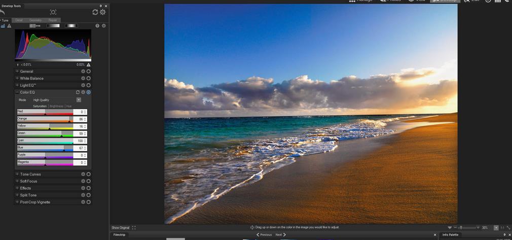 全新更丰富的降噪功能、经过优化的色调曲线、画笔和渐变工具,助您达到前所未有的完美效果。通过精准滤镜工具包进行微调,您可以运用强大的色彩校正工具(如“分离色调”和“颜色均衡器”)来改善色彩。使用裁剪、翻转、调整大小和旋转等工具处理几何缺陷。修正瑕疵、红眼、模糊、噪点和清晰度。通过添加文字、边框、晕影、水印,甚至在图像上绘图,让图像更加生动。选择编辑模式画笔、更改或优化图像局部,以达到理想的效果。