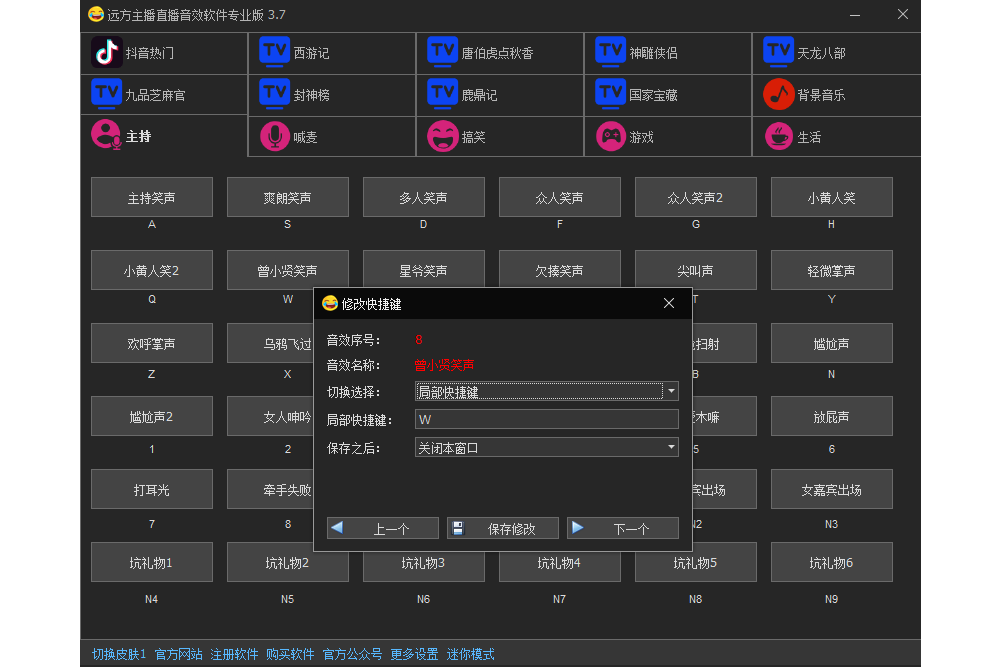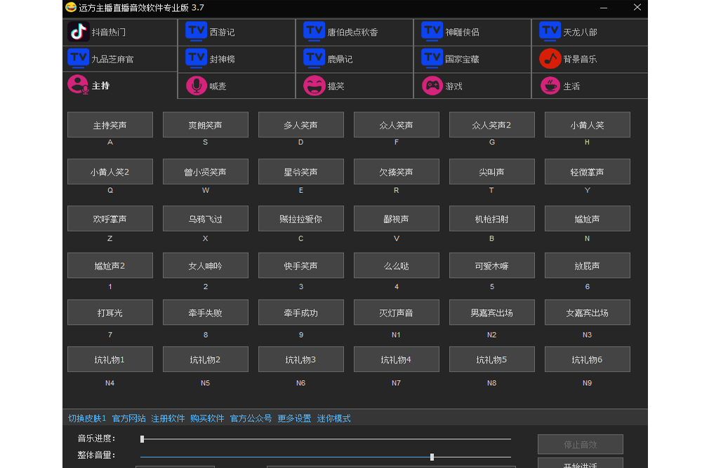 音效分类:主持、喊麦、搞笑、游戏、生活 、抖音热门、西游记、唐伯虎点秋香、神雕侠侣、天龙八部、九品芝麻官、封神榜、鹿鼎记、国家宝藏。