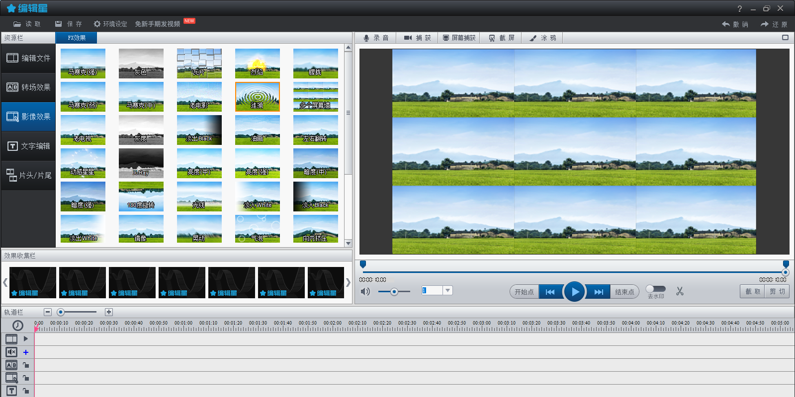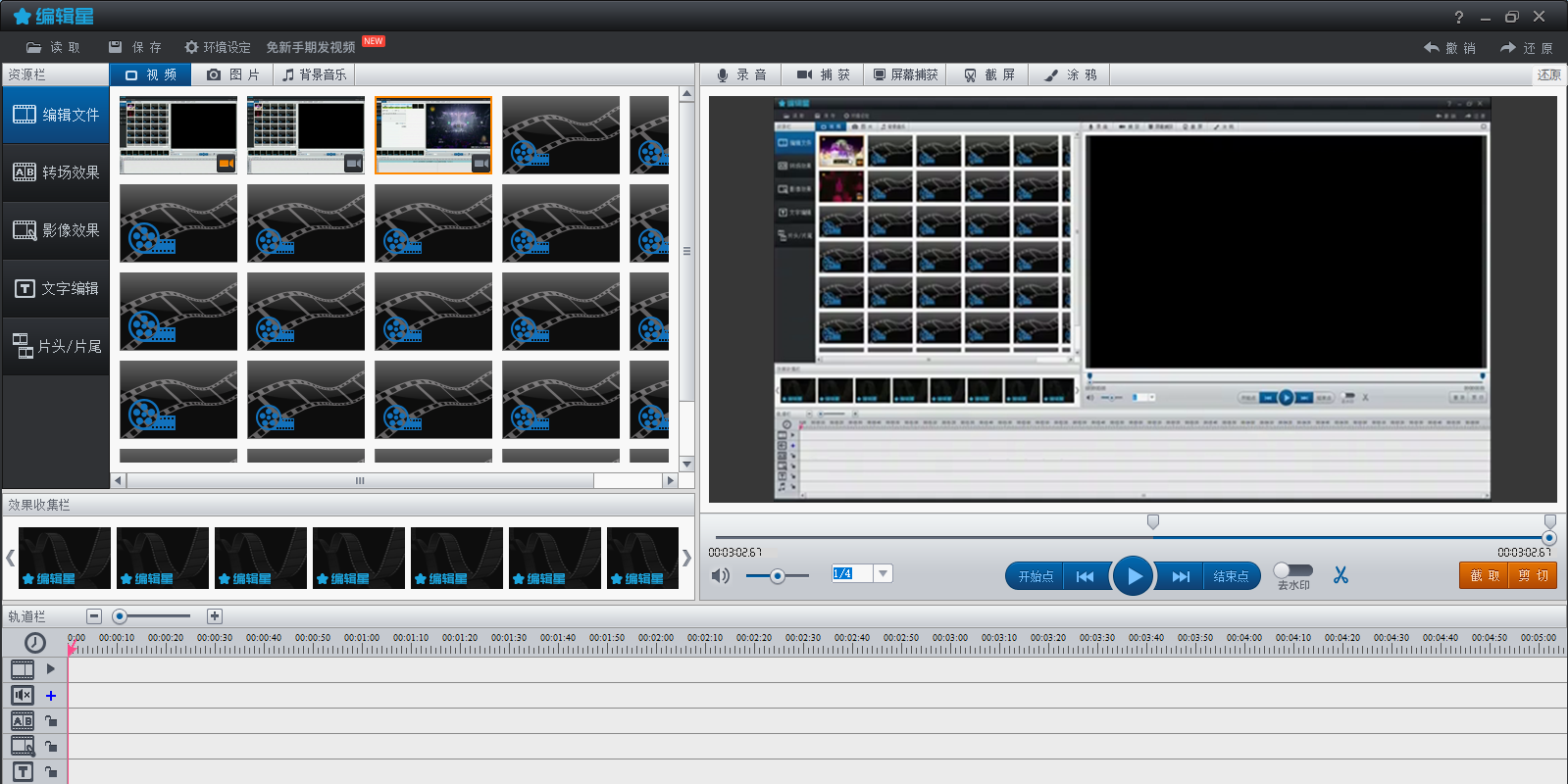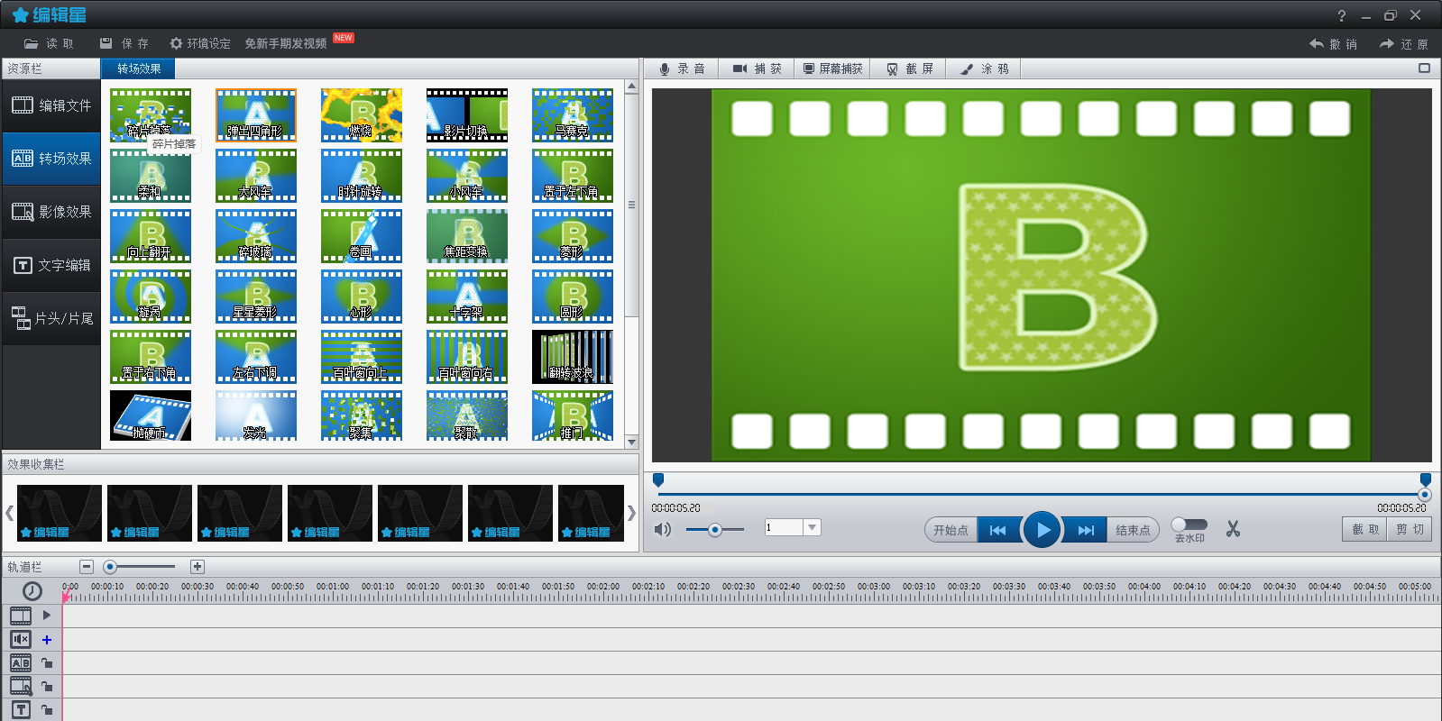 2.软件自带各种效果素材,包含转场效果、影像效果、文字效果、背景音乐及录音等,可以自由插入和重叠使用。