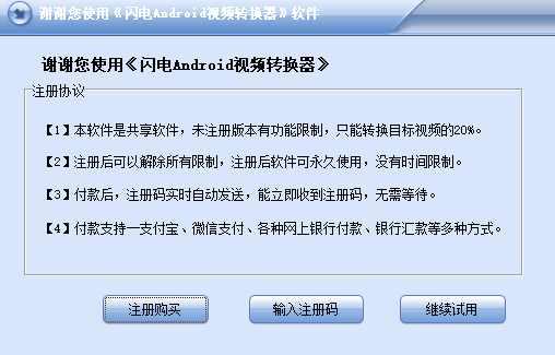 《闪电android视频转换器》是一个功能强大的android手机视频转换软件,可以帮助您将各种流行的视频格式转换为android手机所支持的视频格式。转换后的视频可以在使用android平台的三星、vivo、华为、中兴、oppo、小米 、荣耀、金立、魅族、酷派、360等多系列各种型号android手机播放。本android手机视频转换器采用先进的视频编码解码技术,所以转换视频速度极快,转换视频质量极高。用它可以把电脑上的视频和音频都转到android手机上,随时随地看电影欣赏音乐。本软件还支持android系统的各种平板电脑和android系统的智能电视视频格式转换。本android手机视频转换器设有专门的分类功能:有通用android视频格式、高清晰android视频格式(mp4视频格式)、优化的android视频格式mpeg-4、h.264编码的android视频格式、h.263编码的android视频格式(3gp、3g2视频格式)等,可以满足您的不同转换需求,使您即可享受高清晰的视频质量,又节省您的宝贵存储空间。本android手机视频转换器,可转换rm、rmvb、vob、dat、dvd、vcd、svcd、wmv、asf、flv、mkv、mov、qt、mpeg、avi、mp4、3gp等常见视频格式,对于不常见的hd高清视频如mts、mod、ts、m2ts、avchd等均能进行识别转换。本android视频转换器还支持各种视频文件的播放预览,支持更换软件皮肤,操作极为简单,支持批量转换,支持自动关机。