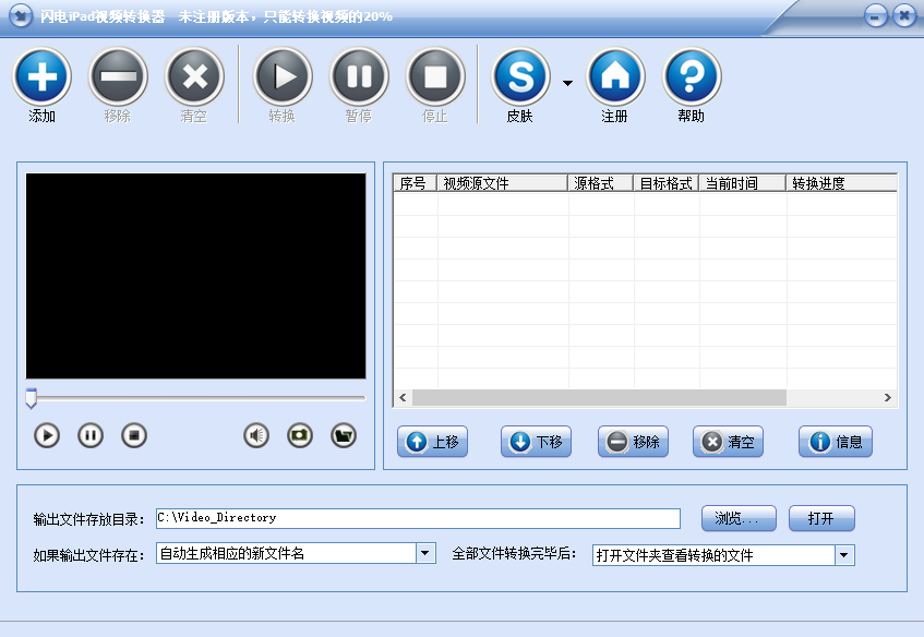 《闪电ipad视频转换器》是一个功能强大的苹果ipad视频转换工具,可以帮助您将各种流行的视频格式转换为苹果ipad所支持的视频格式。本ipad视频转换器采用先进的视频编码解码技术,所以转换视频速度极快,转换视频质量极高。用它可以把电脑上的音视频都转到ipad上,随时随地看电影欣赏音乐。本ipad视频转换器设有专门的分类功能:有标准ipad视频格式、高清晰ipad视频格式、优化的ipad视频格式mpeg-4、h.264编码的ipad视频格式、720p、1080p的hd高清ipad视频格式等,可以满足您的不同转换需求,使您即可享受高清晰的视频质量,又节省您的宝贵存储空间。本ipad视频转换器,除了可转换rm、rmvb、vob、dat、dvd、vcd、svcd、wmv、asf、flv、mkv、mov、qt、mpeg、avi、mp4、3gp等常见视频格式,对于不常见的hd高清视频如mts、mod、ts、m2ts、avchd等均能进行识别转换。本ipad视频转换器还支持各种视频文件的播放预览,支持更换软件皮肤,操作极为简单,支持批量转换,支持自动关机。