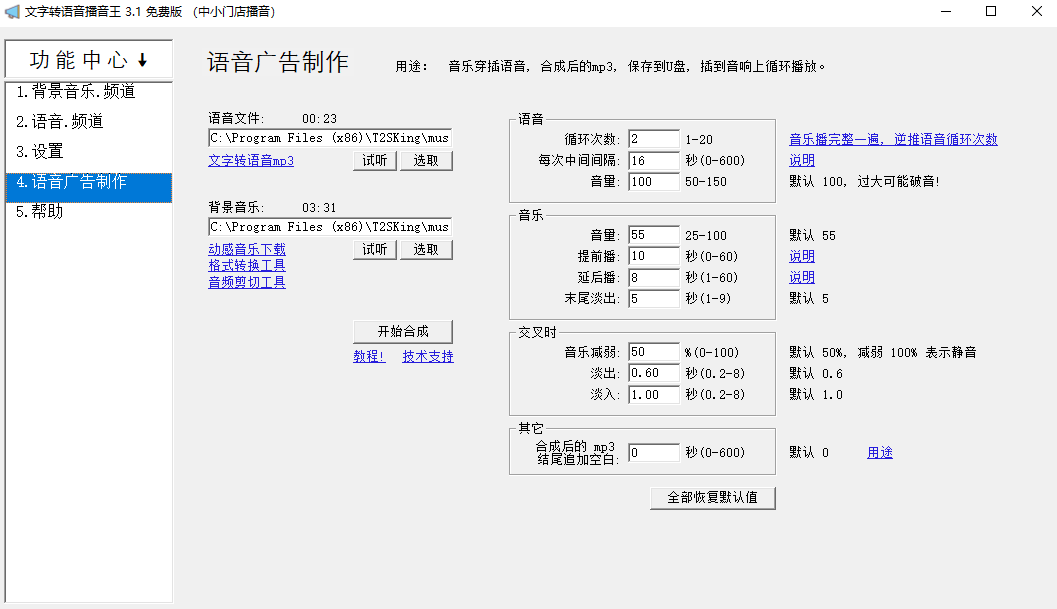 背景音乐和语音交叉时,可设置音乐淡入淡出的时长。