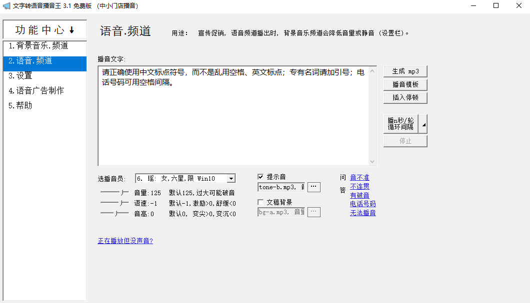 语音频道:宣传促销,每次间隔循环文字播音n秒或n轮。