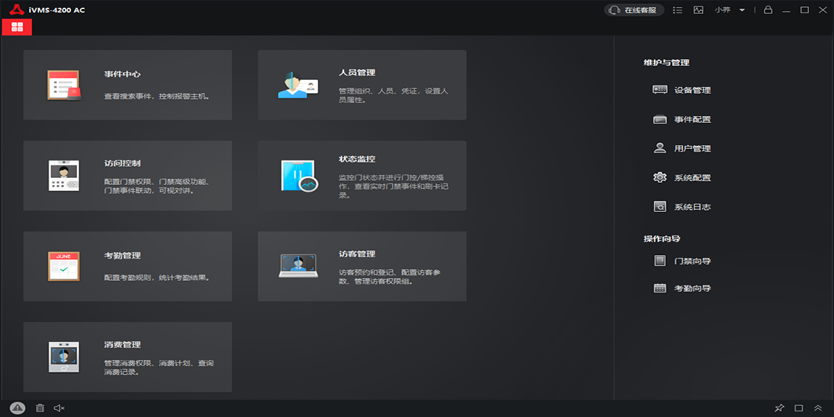 ivms-4200 ac客户端是为非视频业务开发的软件综合应用程序,可满足用户多方面需求,如设备管理、人员管理、远程配置、访问控制、考勤管理、日志查询等。客户端可与门禁考勤设备、可视对讲设备、报警设备等配套使用,管理园区、社区人员的出入权限,以及企业员工考勤数据等,提供灵活、多样的部署方案。