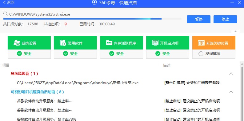 360杀毒只需一键扫描!快速、全面地诊断系统安全状况和健康程度,并进行精准修复