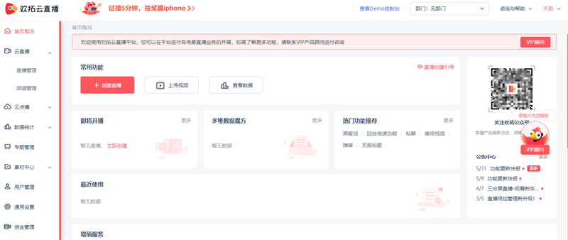欢拓云直播致力于提供各行业的互动直播saas云服务,根据您的业务需求订制还原线下场景的解决方案,让你快速拥有专业、稳定、快速、流畅的直播平台。