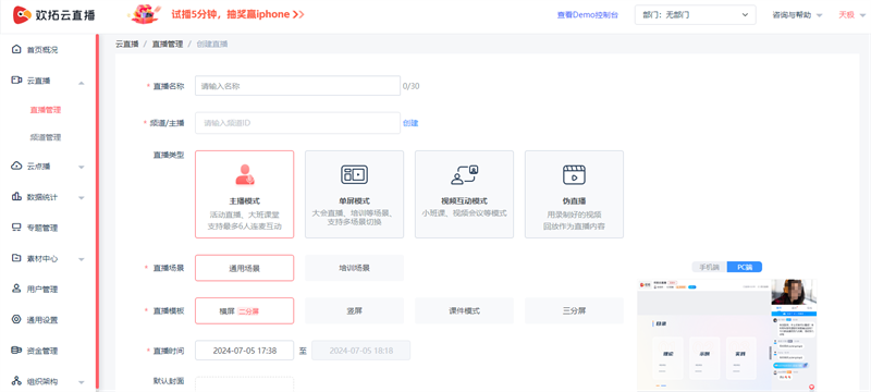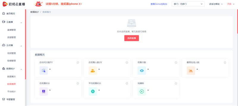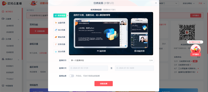 欢拓云直播以直播互动、点播技术为核心,其互动营销功能丰富,能根据教育、金融、电商、会议、培训、大会、医美、医疗等行业场景,快速定制企业品牌直播间。