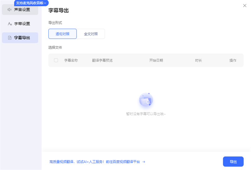 百度ai同传助手是一款轻量级音视频同传字幕工具,一键开启,实时生成同传双语字幕。能够帮助用户实时翻译各种各样的语言,生成同传双语字幕,翻译速度快,结果准确度高。百度ai同传助手融合了上下文的神经网络翻译模型,译文流畅,适用于多种使用场景,全面满足用户的需求。