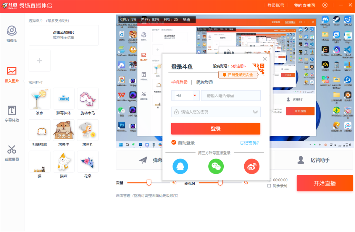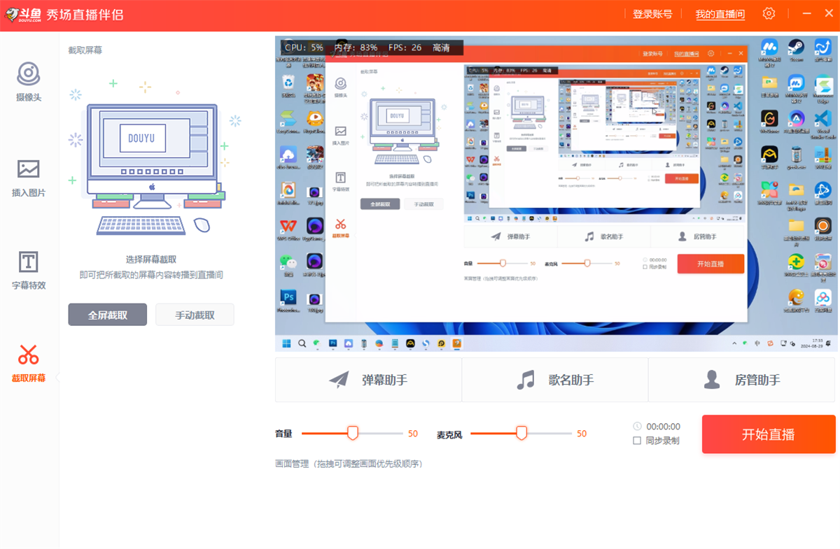 斗鱼秀场直播伴侣电脑版是斗鱼专为秀场主播推出的一款pc直播软件,与普通版本的斗鱼直播伴侣不同的是,该软件增加了很多专为秀场主播开发的功能,例如:摄像头智能美颜、添加图片和可爱挂件、添加酷炫字幕特效等,并支持弹幕助手、歌名助手、房管助手、点歌助手等功能,让斗鱼主播可以更好地秀出自己。