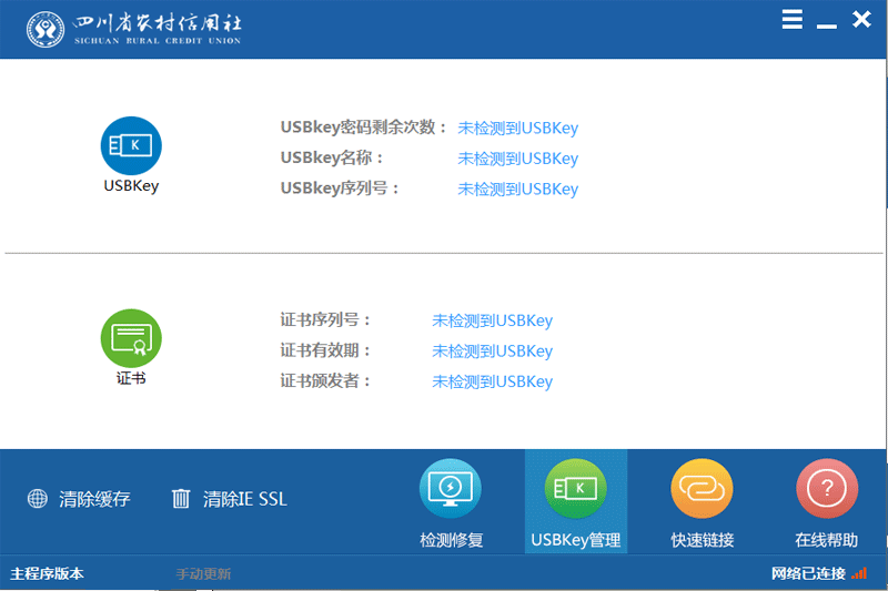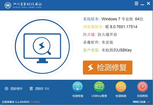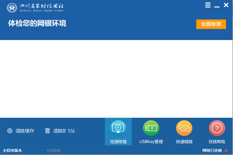 四川农信网银助手官方版有检测修复、usbkey管理、快速链接以及在线帮助四大功能。