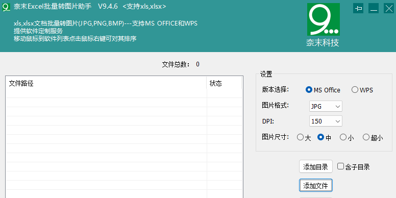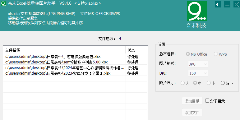 奈末excel批量转图片工具是一款免费格式转换工具,支持将excel格式的文件转换成图片格式,图片格式包括png、jpg、bmp等。奈末excel批量转图片工具转换质量高,还可以保留页眉页脚、表格图片等多种原色,无失真,还可一键批量转换,简单方便。转换后自动为每个excel文件生成同名目录,每一页生成一个图片,存储在所属文件的目录。并可以设置图片的大小,为用户大量的excel转换图片需求提供了优秀的解决方案。