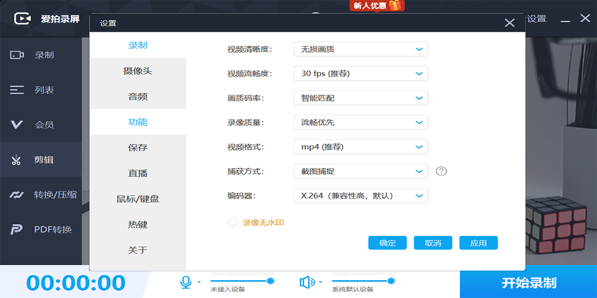 全能强大的录制操作:支持定时录制、自定义修改录制视频帧率和分辨率、鼠标光标和标记、快捷键操作、系统声音和麦克风录制、暂停和恢复录制