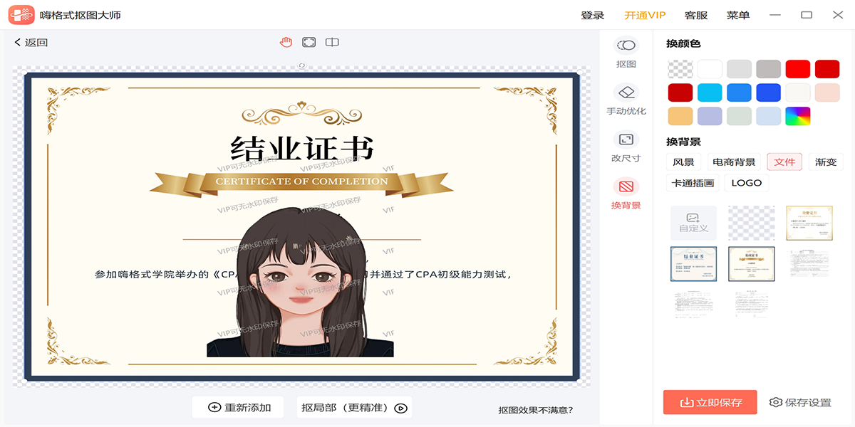 5、证件照换底色:支持各类证件照一寸、二存等尺寸,白/蓝/红底一键生成,智能换背景,压缩大小,尺寸调整,智能排版;