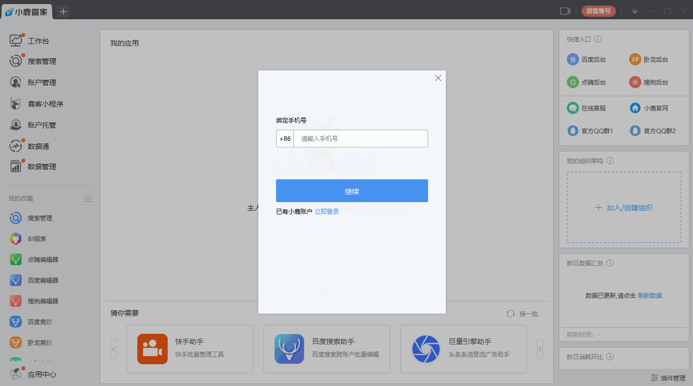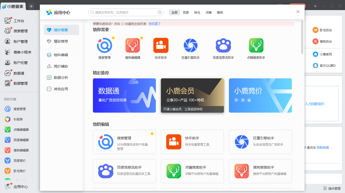 小鹿搜狗助手官方版是一款竞价软件,小鹿搜狗助手官方版支持多账户同时管理、多任务同时进行、一键批量编辑帮你节省一半工作时间,智能竞价,一键锁定排名,提高推广效果。